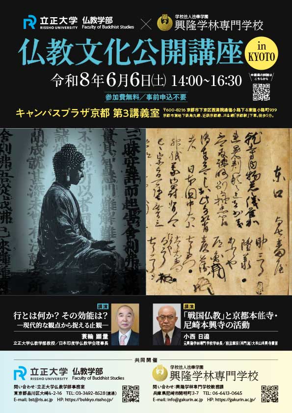 立正大学仏教学部では、京都を会場にして「仏教文化公開講座 in KYOTO」を開催しています。本年度も興隆学林専門学校(兵庫県尼崎市)と共同開催する運びとなり、以下の2つの講演を実施します。参加費無料・事前申込不要です。皆様ふるってご参加くださいますよう、ご案内申し上げます。